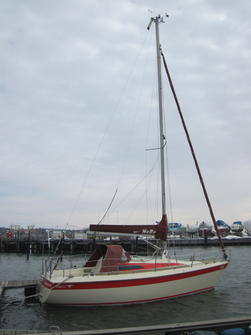 Neustadt Arcora Marina 0700 Uhr bin wieder auf den Beinen um den Rest zu erledigen. Zuerst anfange das rostige Vorschiff, den Vorstagbeschlag musste ich abnehmen und reinigen und polieren, dann wieder montiert. Mit der Zahnbürste und einem Spezialreiniger dann um die Bugkorb, Rellingstützen, Klampen, Ankerkastenscharniere und um den neuen Bodenbelag geschruppt. Danach großflächg die lackieren Flachen und den Bodenbelag gereinigt, eine Sauarbeit das bei Temeraturen um den Gefrierpunkt. Dann war de Ankerkasten dran, nachdem dem auch dieser glänzte konnte ich die ANkerleine mit Kette und Anker anschlagen und verstauen. Nun das Vorsegel auf angeschlagen und eingerollte, das alles mit der Persening abgedeckt. Nun war das Großsegel an der Reihe anschlagen und das Großsegelbergesystem montiert, Reffleinen belegt. Nun alle Leinen ins Cockpit auf die Klemmen gelegt. Nun war es Zeit das ganze Boot zu reinigen, also Pütz raus und schruppen was das Zeug hällt. 1200 Uhr fast alles soweit erledigt das ich nach Paderborn fahren kann. Ankunft in PB kurz nach 1700 Uhr. Ich bin total erledigt von der vielen Maloche. Den Rest von dem Rost werden ich beim ersten Törn entfernen und die Lackteile mit einem Hartwachs versiegeln desweiteren alle Chromteile neu polieren. Daten des Tages |