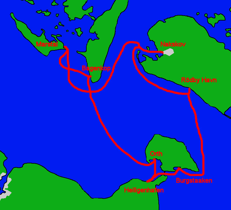 Heiligenhafen- Orth 10:00 Uhr Schiffübernahme mit gründlichen Check und Einweisung in die Tettungsmittel. 13:50 Uhr verlassen den Hafen. 14:00 Uhr Boye über Bord Manöver sowei das Fahrverhalten überprüft. 14:15 Segel setzen. Kurz auf Bagenkop. 17:00 Uhr Umkeht nach Orth auf Fehmarn beschlossen. 20:30 Uhr festgemacht im Hafen