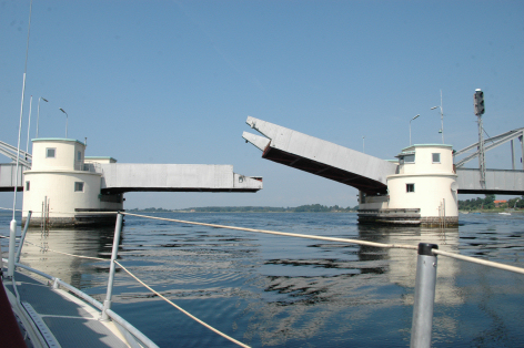 Nach einer kurzen Wartezeit öffnet sich die Brücke. 15:51 Uhr kommt ein leichtes Lüftchen schnell die Segel hoch und den Motor aus. 16:42 Uhr ist auf schon wieder zu Ende mit dem Wind. Unter Motor erreichen wir um 17:50 Uhr den Hafen auf der Insel Femö. |