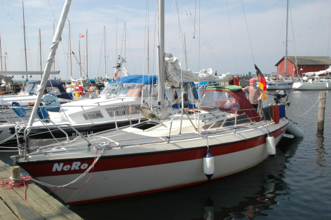 Eine Seemeile vor der Brücke war an Segeln nicht mehr zu denken. Ein starker Gewittersturm mit Sinnflutartigen Regen erwartet uns. Die Segel waren schnell verstaut, alle Luken verschlossen. Alleine saß ich an der Pinne. Keine 50 Meter war die Sicht. Unter der Brücke war der Spuk auch schon wieder vorbei. Der Wind lässt nach und die Sonne trocknet die NeRo. Die Genua hatte den Sturm nicht unbeschadet überstanden. Das Achterliek hatte ein kleinen Riss. Das Segel war schnell gegen die kleine Genua getauscht. 15:58 Uhr machten wir in Marstall provisorisch fest, ein weiterer starker Regenschauer hatte eingesetzt. Das war dann auch der letzte Regen des Tages. Abends traf dann auch die Albatros ein. Alle hatte viel zu erzählen und die ein oder andere Dose Bier wurde geleert. Die Kinder spielten bis es dunkel war. |