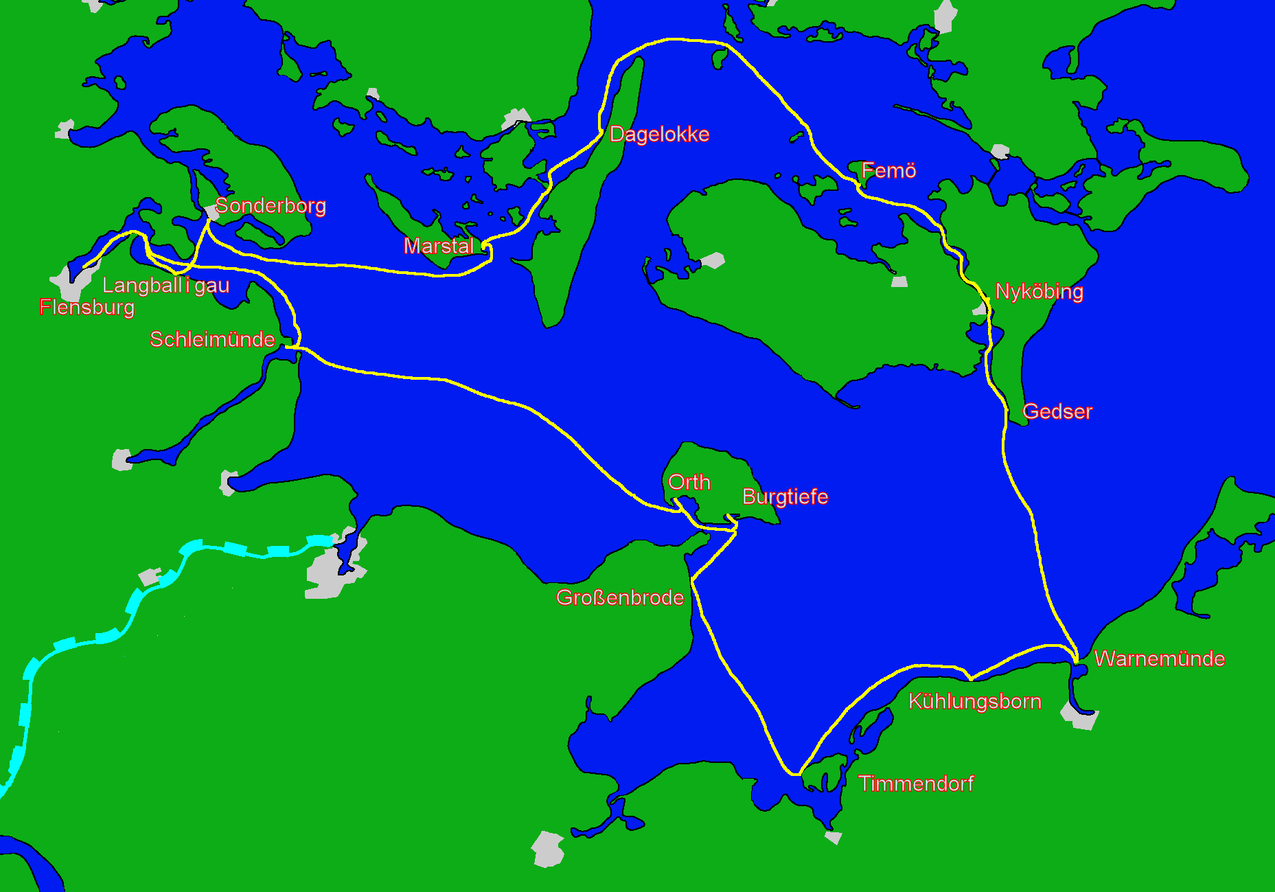 Schleimünde - Orth Nach dem aktuellen Wetterbericht mussten wir unsere Route über Bagenkop nach Fehmarn zu gelangen verwerfen. Es war kein Wind angesagt und unter Motor können wir ja auch direkt nach Fehmarn fahren. So gegen 15:00 Uhr setzte der Wind aus SW ein. Segel hoch und Motor aus. um 19:00 Uhr kam der Leuchtturm Flügge in Sicht. Der Wind wehte nun mit einer Stärke 5 aus SW. Wir waren froh um 20:30 Uhr im Yachthafen von Orth (Fehmarn) festmachen zu können. Der Wind frischte weiter auf. Nach einen ausgiebigen Abendspaziergang ging es dann zu Bett. Daten des Tages Tagesweg über Grund 41,33 Seemeilen Höchstgeschwindigkeit 7,1 Knoten Motorzeit 6 Stunden 39 Minuten |