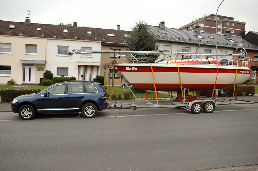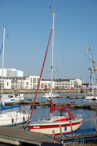 Die NeRo kommt ins Wasser - Wismar Meine Nacht verbrachte ich in der NeRo auf dem Trailer. Um 07:00 Uhr bin ich aufgestanden. Nach und nach bereitete ich das Schiff für den Kran vor. Kurz vor 09:00 Uhr trafen die Mitarbeiter vom Westhafen ein. Man erzählte mir das ich erst am Samstag kranen könnte, natürlich intervenierte mit Erfolg. Um 09:15 Uhr schwamm die NeRo in ihren Element. Der Motor sprang prima an. Ich verholte die NeRo zum Liegeplatz.
