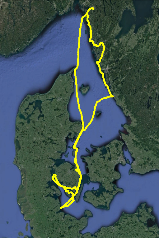 Varberg - Ankerplatz südlich Grenaä 0745 Uhr verlassen ich den Hafen. Habe lange gegrübelt wie es aufgrund der Grosswetterlage weiter geht. Immer wqieder Starkwind aus SW ist angesagt bis auf eine kleines Windloch mit weniger Wind heute. Die Entscheidung viel gegen den Öresund und für den Großen Belt. Vor dem Hafen stand eine 2 - 3 Meter hohe Welle aus SW. Also ersteinmal Kurs West halten. Nach 4 Stunden beruhigte sich langsam, wie vorhergesagt, die See aber permanet mit Motor und gereffte Groß. Kurz vopr Mitternacht etwas südlich von Grenaä beschloss ich auf die Küste zuzuhalten und den Anker zu werfen. um 00:30Uhr lag ich dann im Bett.